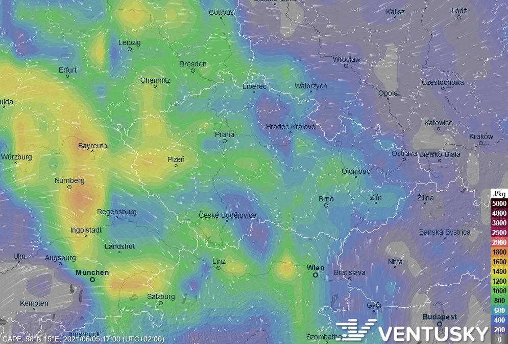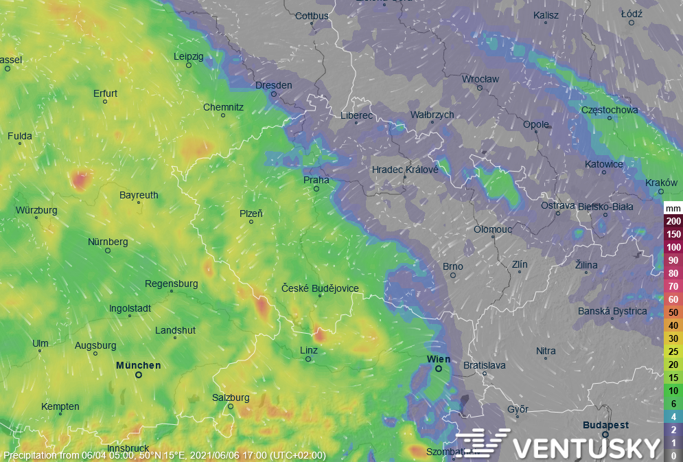 Očekávané srážkové úhrny o víkendu (za 48 hodin) - srážky se vyskytnou hlavně v západní polovině Čech. V bouřkách budou lokálně ještě vyšší, než zachycuje model
