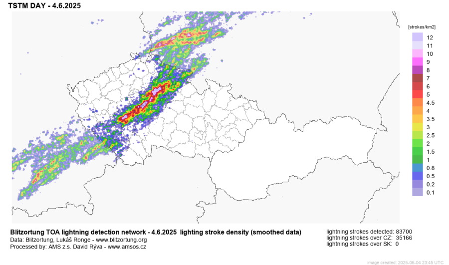 Hustota blesků za 4.6.2025 - význačná je na jihu a východě Středočeského kraje, zdroj: blesky.bourky.cz