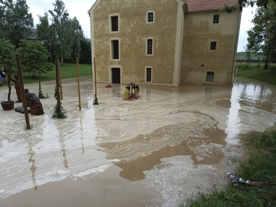Dalešic dnes odpoledne - hasiči odčerpávali vodu ze zatopených míst, zdroj: hzscr.gov.cz