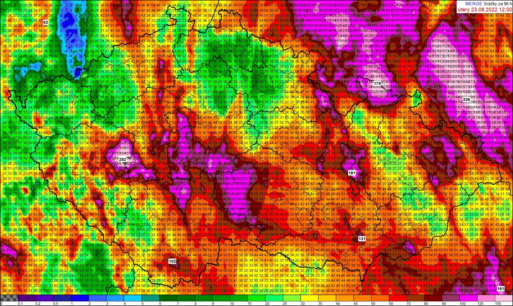 Srážkové úhrny v Česku od pátku do pondělí za 4 dny - ve fialově označných oblastech spadlo přes 100 mm