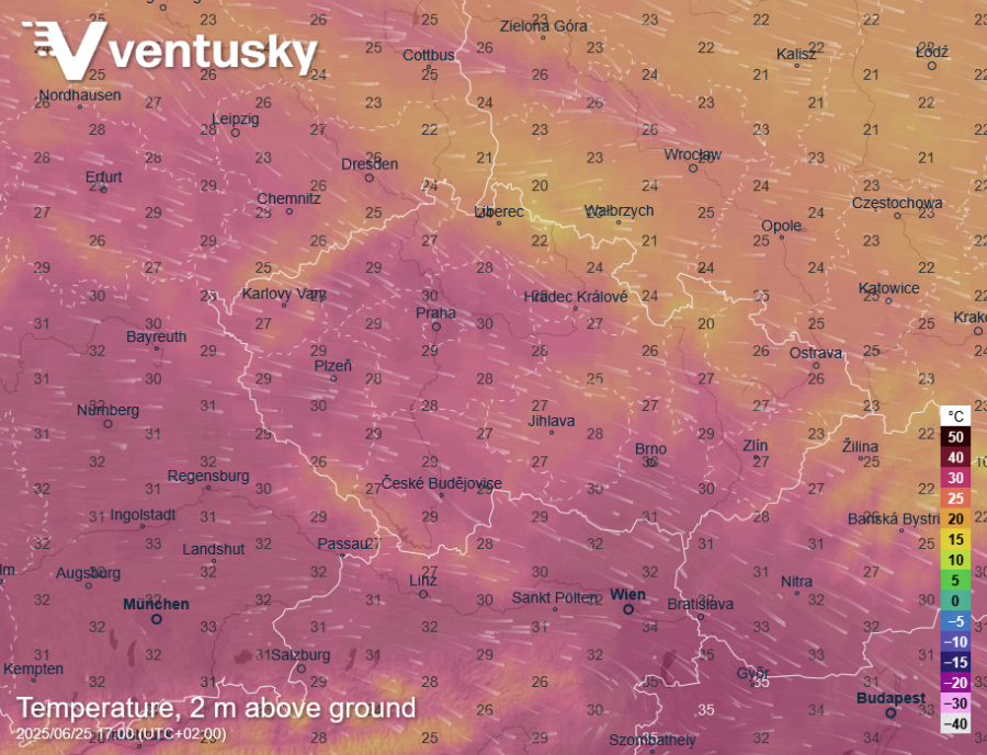 Očekávané teploty ve středu - kromě severovýchodu budou často tropické, zdroj: ventusky.com