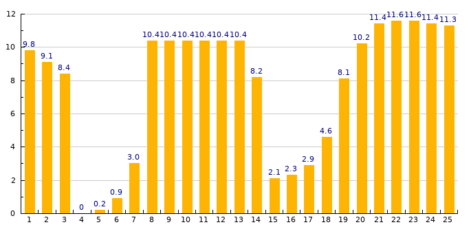 Doba slunečního svitu v březnu 2022 po dnech na stanici v Praze Libuši