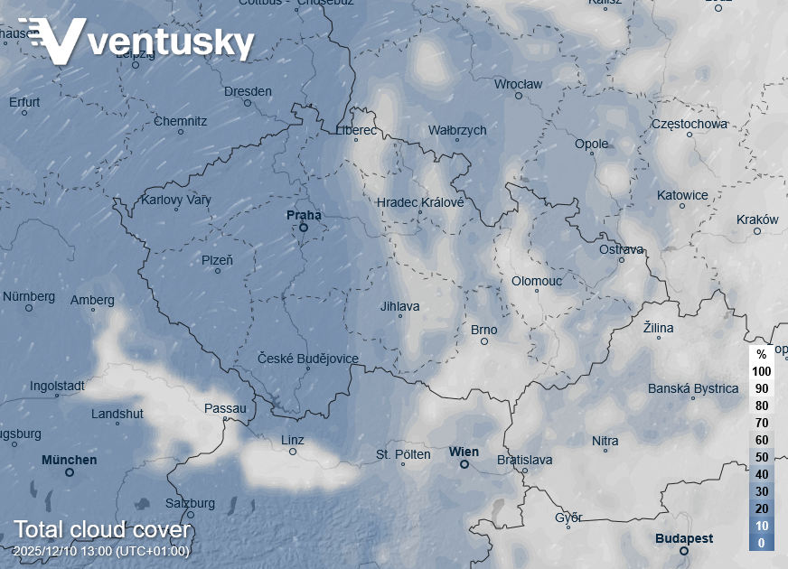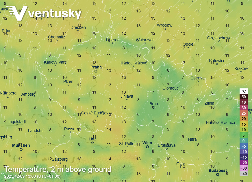 Očekávané teploty ve středu odpoledne - v nejteplejších oblastech může být až 15 °C