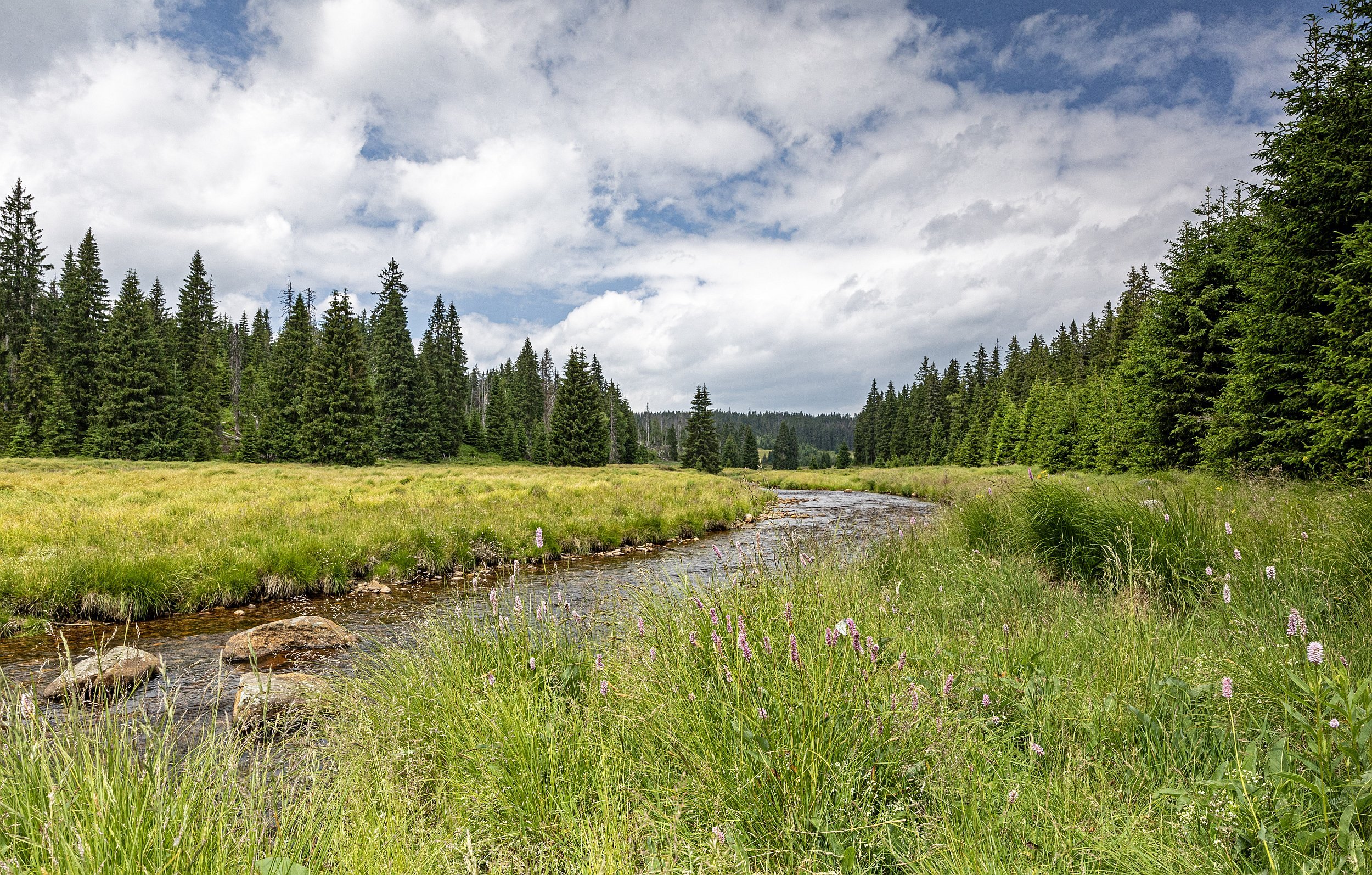 Modrava v pondělí 3.7.2023 - vody v Roklanském potoce je relativně málo po suchém červnu