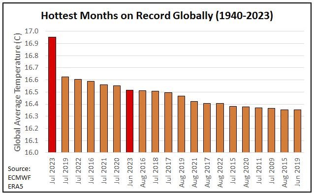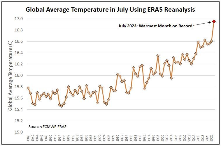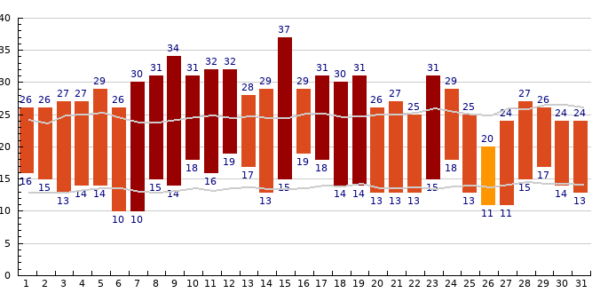 Graf zobrazuje nejvyšší a nejnižší denní teploty v průběhu července 2023 na stanici Praha Libuše, šedou čárou jsou znázorněny dlouhodobé průměry pro daný den