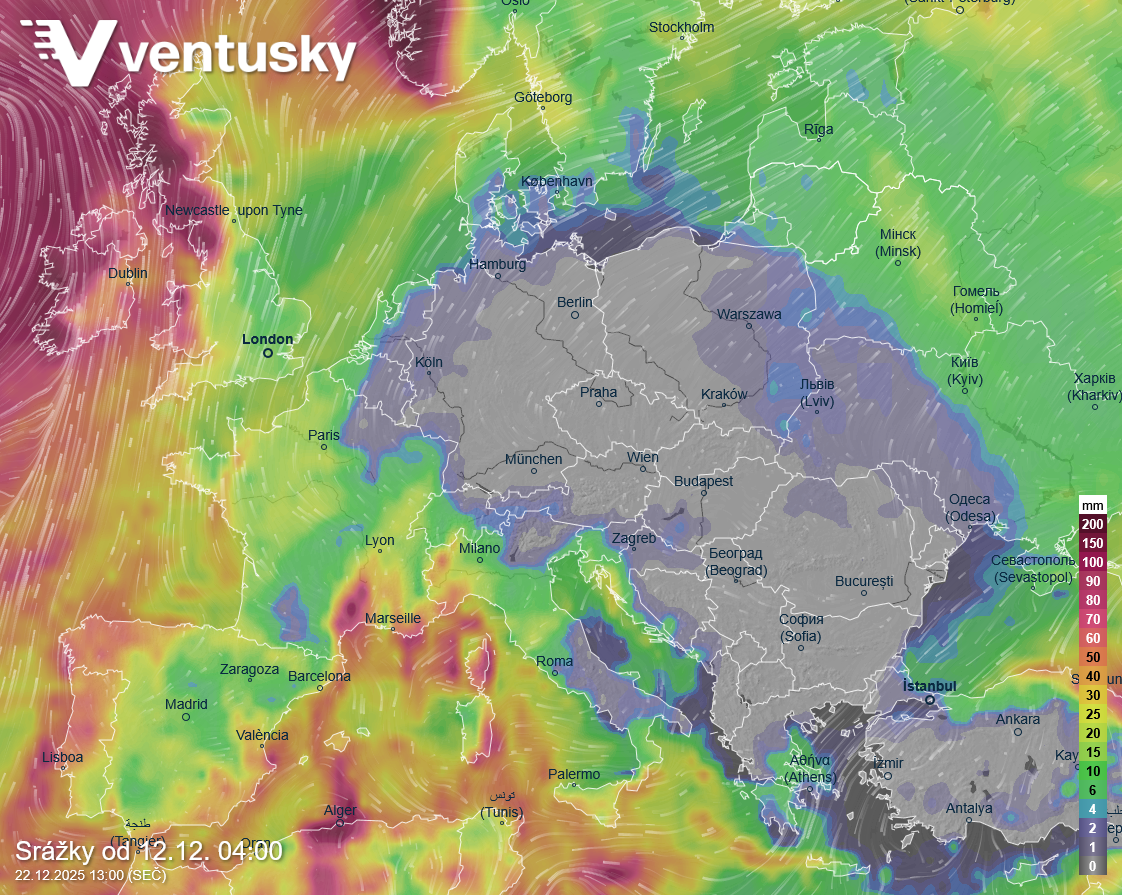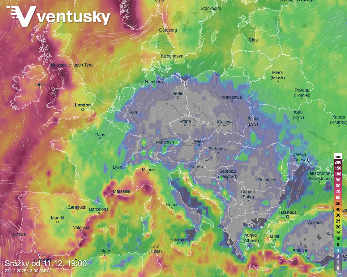 Očekávané srážky podle modelu ECMWF do 22. prosince