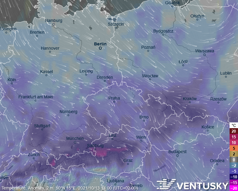 Odchylka teploty vzduchu ve středu odpoledne vůči průměru 1981-2020 - ve střední Evropě budou teploty výrazně podprůměrné