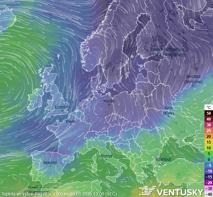 Teplota v hladině 850 hPa (ve výšce cca 1500 m nad zemí) v pondělí - v této hladině je dobře patrný příliv původem arktického vzduchu do Evropy, studený vzduch se rozlije až daleko k jihu