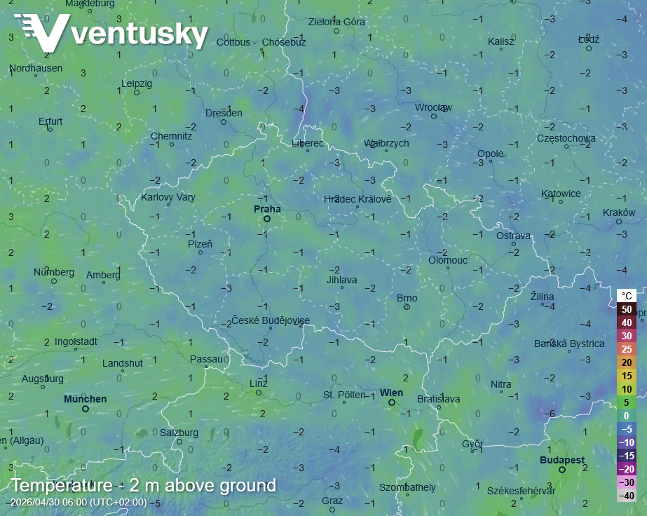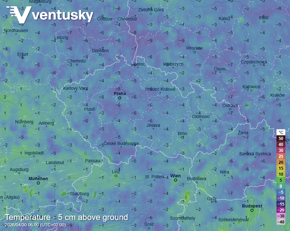 Očekávané teploty v 5 cm nad zemí ve čtvrtek ráno