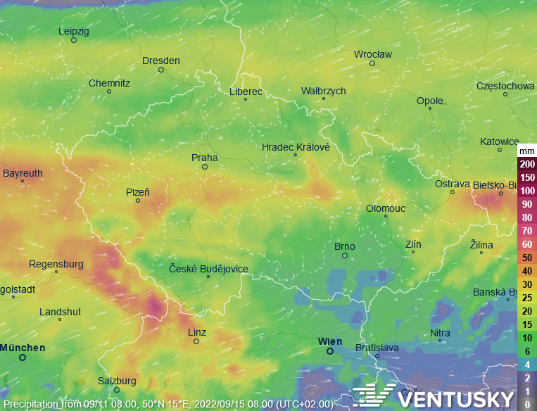 Očekávané srážkové úhrny do čtvrtečního rána - většina srážek spadne během středy