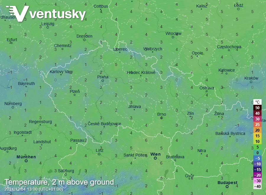 Očekávané teploty ve středu odpoledne - budou mezi 1 °C až 5 °C, což jsou běžné hodnoty v úvodu prosince