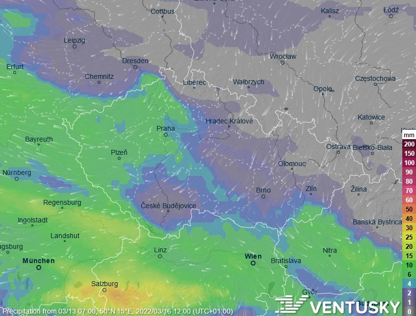 Srážky do středečního rána podle modelu ICON EU - model na zhruba polovině území očekává déšť. Jiné modely ovšem očekávají, že se více srážek dostane i do severovýchodní poloviny našeho území