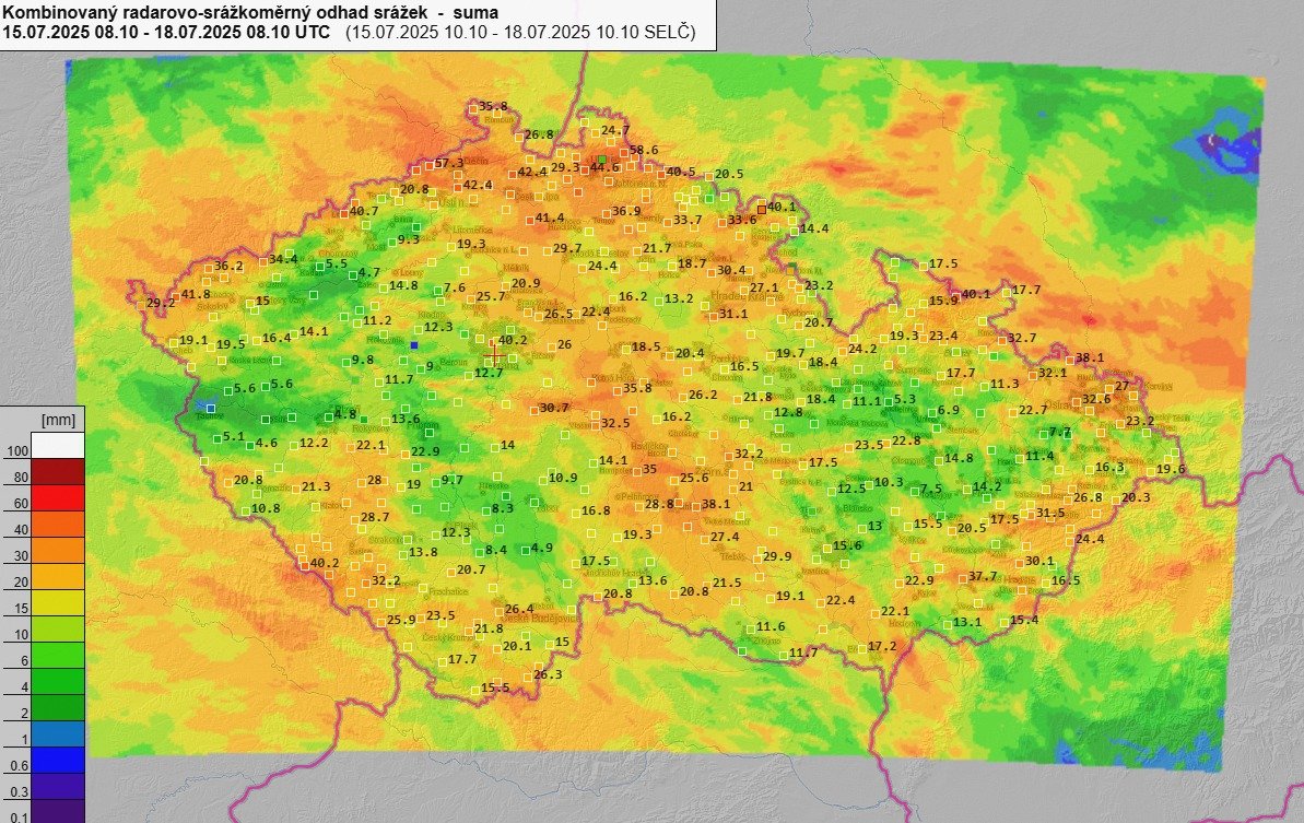 Srážkové úhrny od 15.7.2025 (úterý) 10:00 do 18.7.2025 (pátku) 10:00
