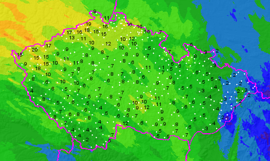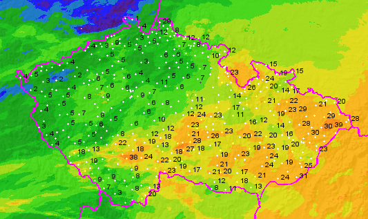 Srážkové úhrny za 24 hodinod sobotního poledne do nedělního poledne na studené frontě, která přes naše území přešla po teplé frontě a přinesla na jih i silné bouřky