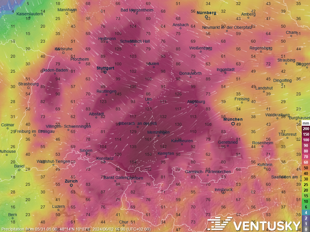 Očekávané srážky na jihu Německa do nedělního poledne - spadne zde i přes 150 mm