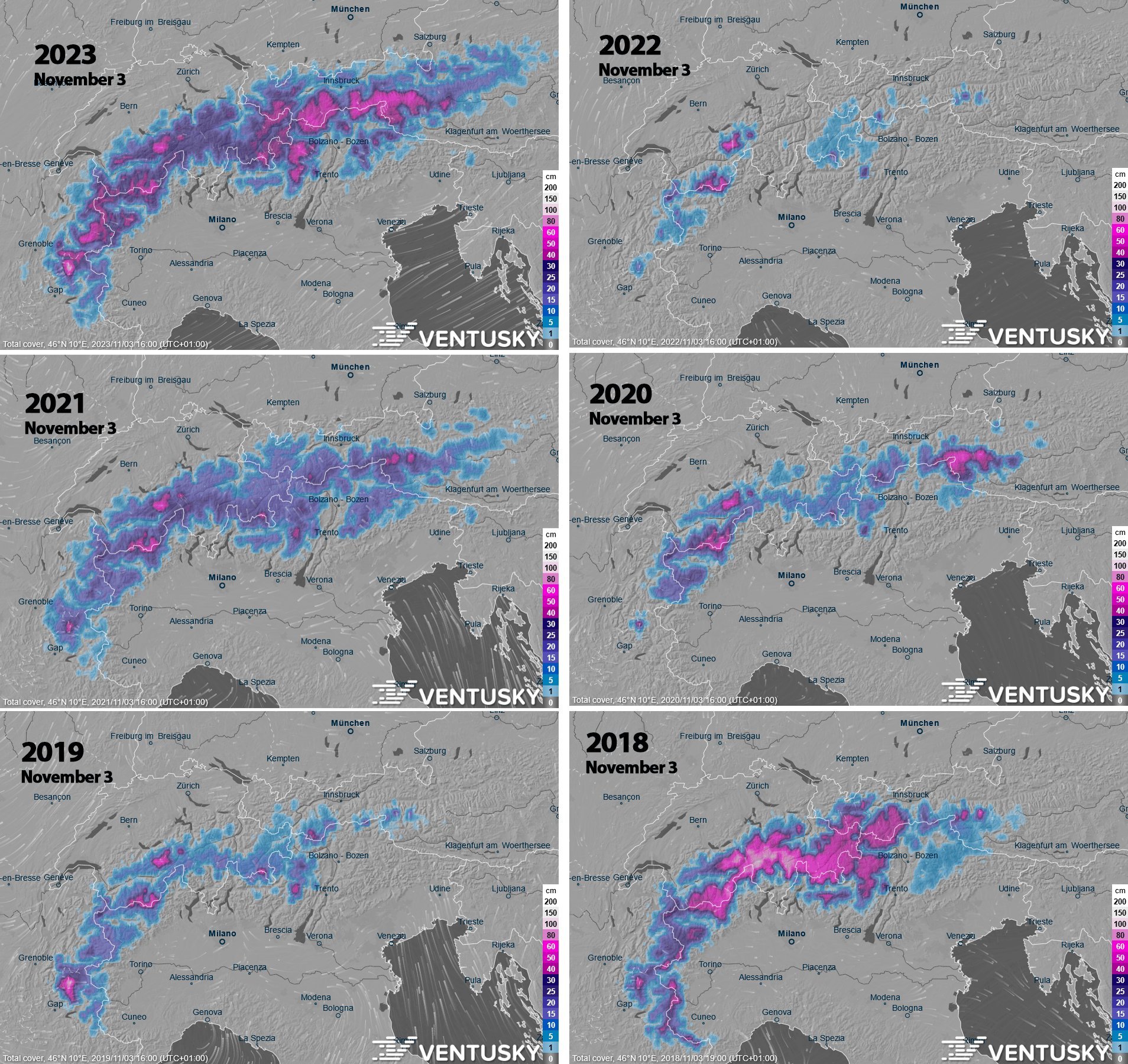 Sněhová pokrývka v Alpách za posledních 6 let pro 3. listopadu