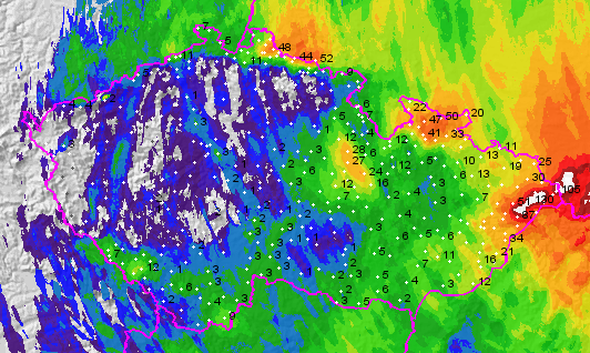 Srážky od včerejších 8:00 do dnešních 8:00 (za 24 hodin) - nejvíce pršelo v Beskydech, kde spadlo i přes 100 mm srážek (část srážek spadla i mimo uvedené období)