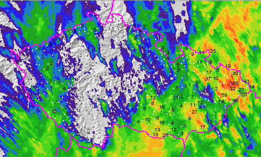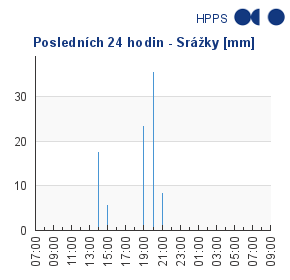 Hodinové srážkové úhrny na stanici Frýdek-Místek za posledních 24 hodin
