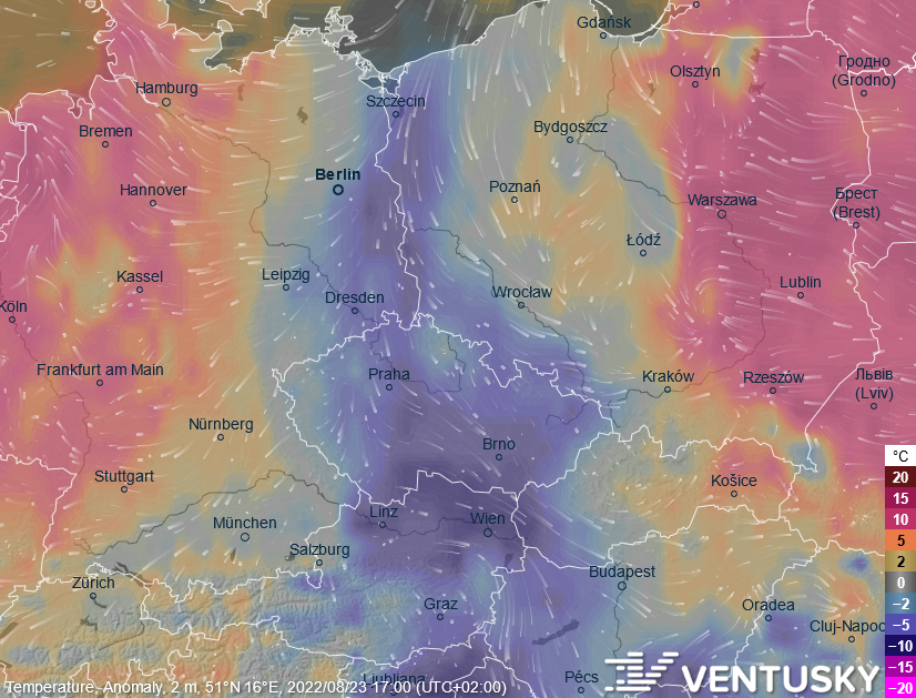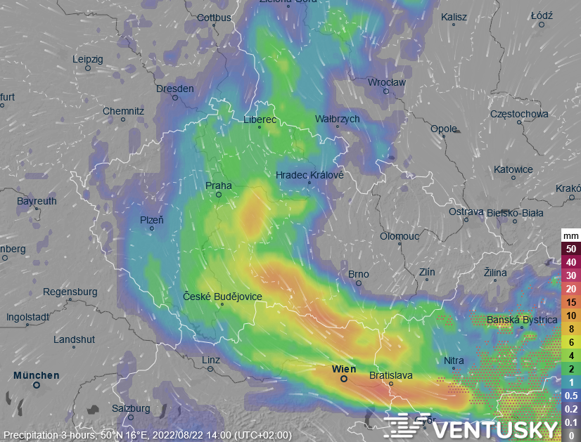 Očekávané srážky v pondělí v poledne - úhrny za 3 hodiny. Nad naším územím se stále bude udržovat mohutné srážkové pásmo