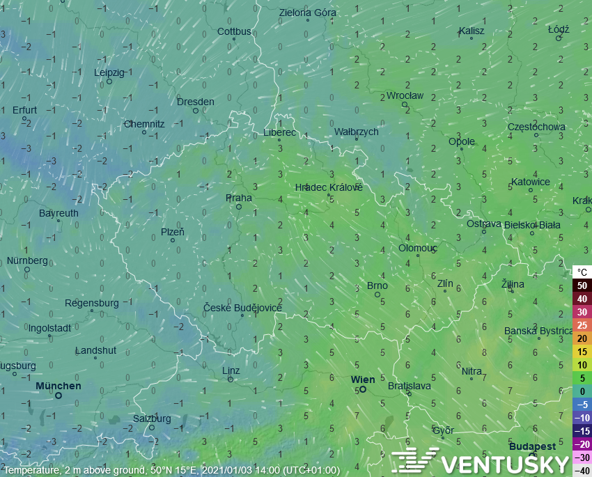 Očekávané teploty v neděli odpoledne podle modelu ICON EU - v oblastech s teplotami kolem bodu mrazu se bude tvořit sněhová pokrývka