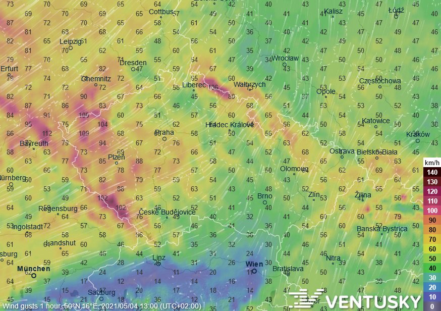 Očekávaná rychlost větru v nárazech v úterý ve 13:00 - na západě bude vítr velmi silný