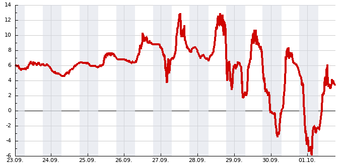 Vývoj teplot na Horské Kvildě za posledních 7 dní - poprvé po létě zde byl zaznamenán mráz pod -5 °C