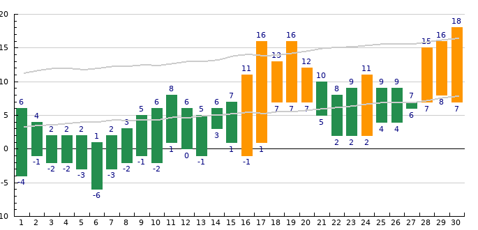 Graf zobrazuje nejvyšší a nejnižší denní teploty v průběhu měsíce v Praze Libuši, šedou čárou jsou znázorněny dlouhodobé průměry pro daný den, zdroj: in-pocasi.cz