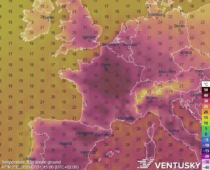 Očekávané teploty ve Francii a okolí v pátek odpoledne - hlavně na severu Francie se dostanou ke 40 °C