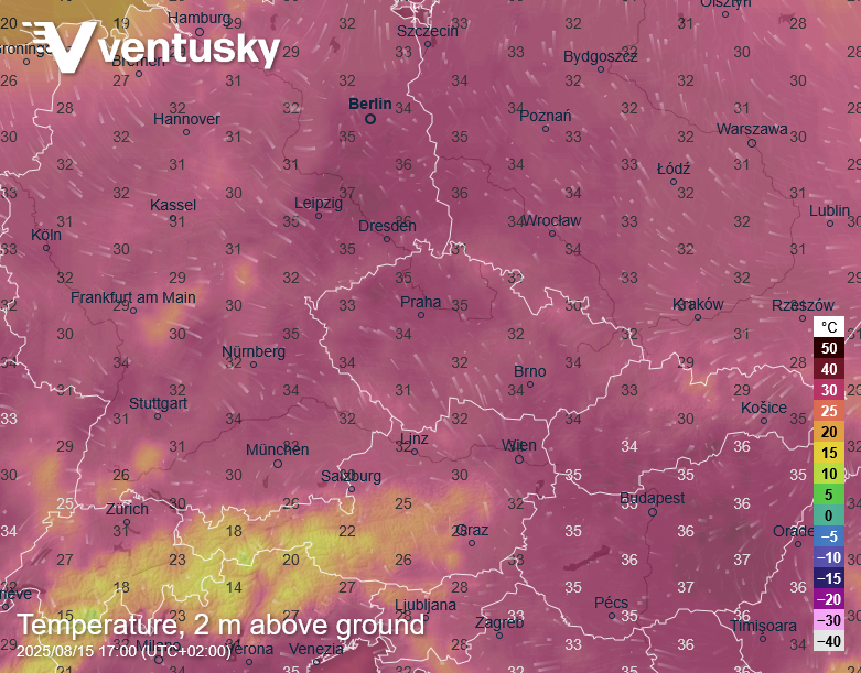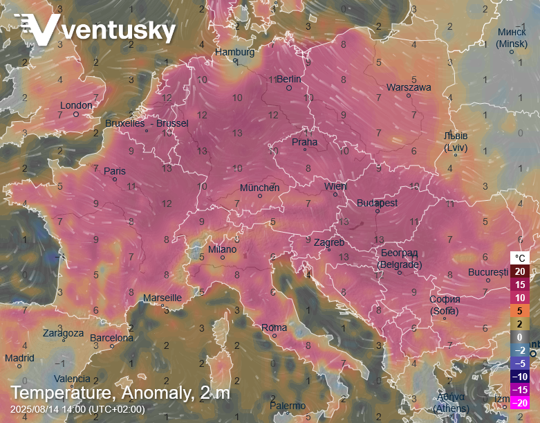 V polovině týdne budou teploty ve střední a přilehlé oblasti západní Evropy asi o 10 °C vyšší než dlouhodobý průměr