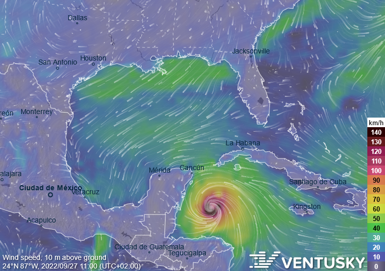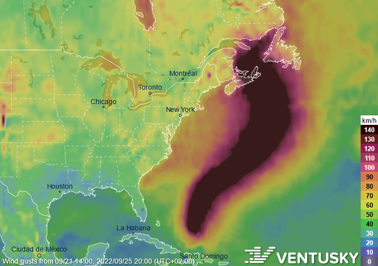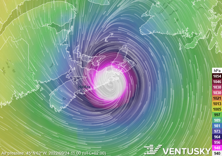 Tlak v centru Fiony, resp. z ní vznikající mimotropické cyklóny by v sobotu mohl u Nového Skotska klesnout až k 930 hPa