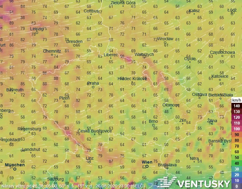 Očekávané maximální nárazy větru zítra během dne - hlavně v Karlovarském kraji budou ve vyšších polohách dosahovat až 90 km/h