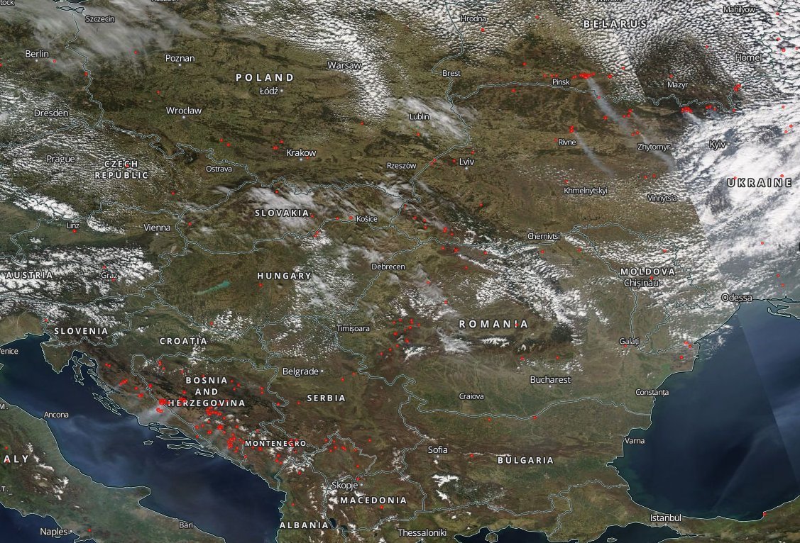 Satelitní snímek z 9. dubna zachycující požáry na jihovýchodě Evropy - červenou tečkou se označeny oblasti s možným výskytem požáru. V pravém horním rohu jsou nad Kyjevem patrné požáry u Černobylu