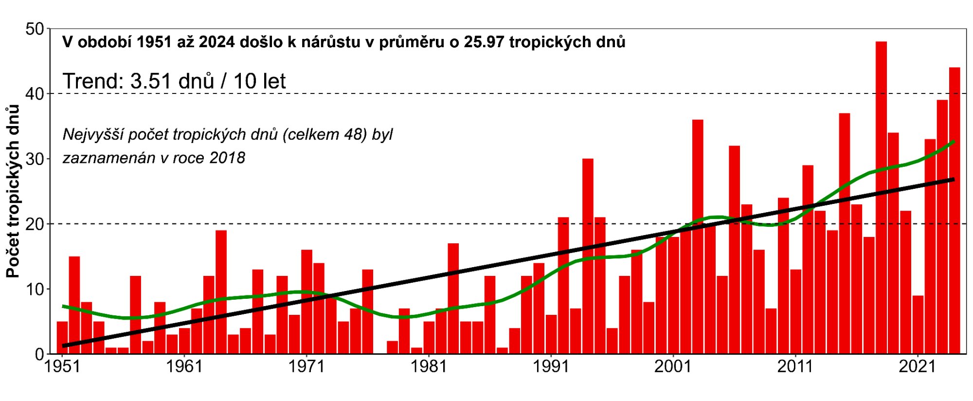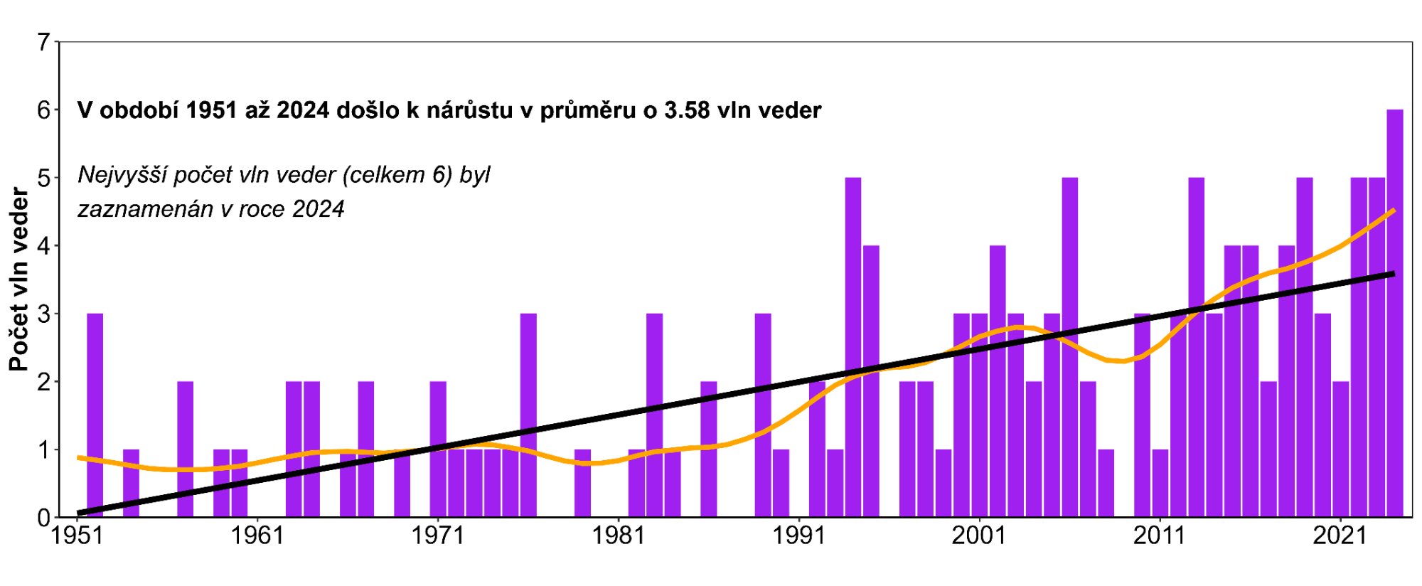 Obr. 2 Roční četnost vln veder na stanici Doksany v období 1951–2024 doplněná o lineární trend (černě) a Gaussův filtr (oranžově).