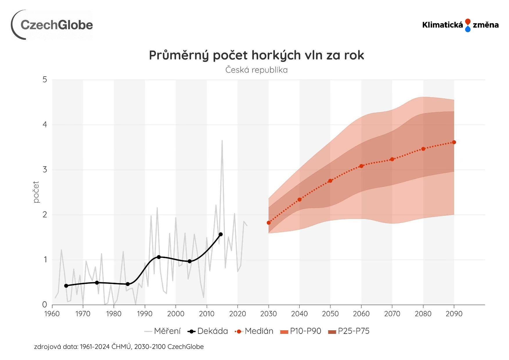 Obr. 5 Počet vln veder (jako alespoň 3 dny za sebou s teplotami nad 30 °C) od roku 1961 a jejich vývoj do budoucna