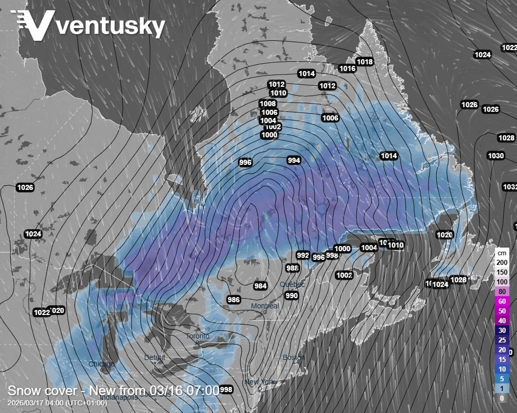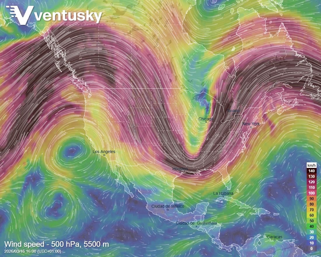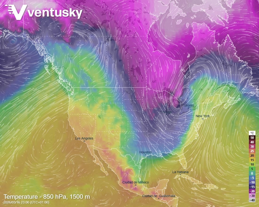 Obr. 3 Rozložení teploty vzduchu v tlakové hladině 850 hPa v pondělí okolo 23:00 UTC nad Severní Amerikou