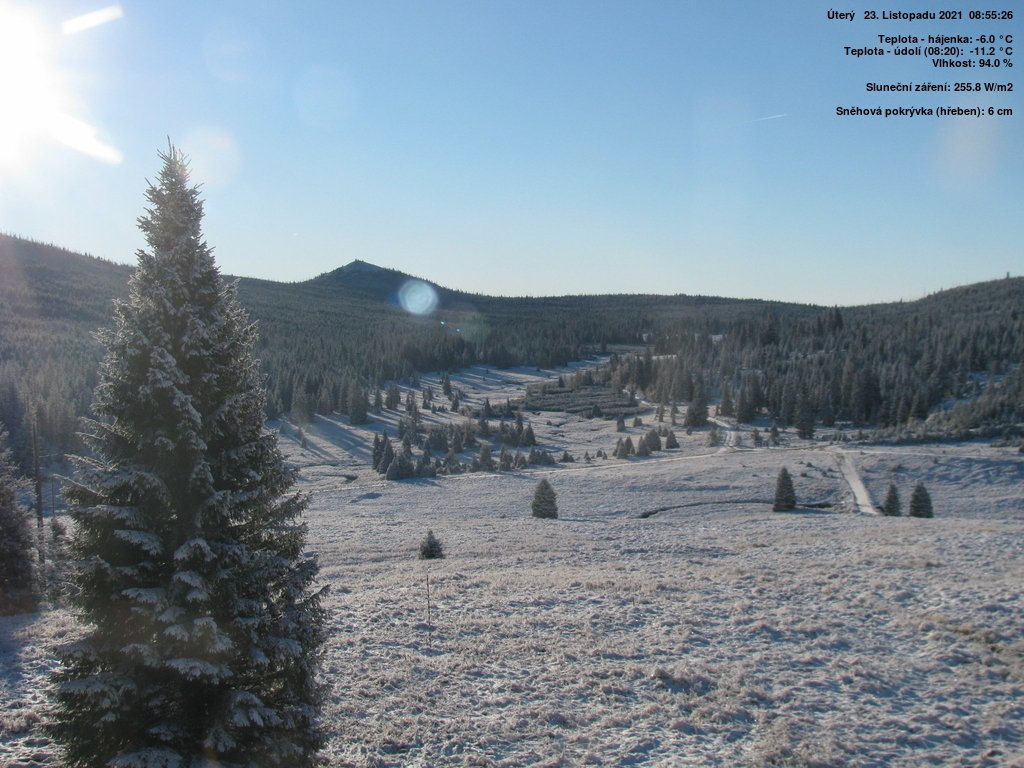 Březník na Šumavě dnes ráno - v okolí leží kolem 5 cm sněhu