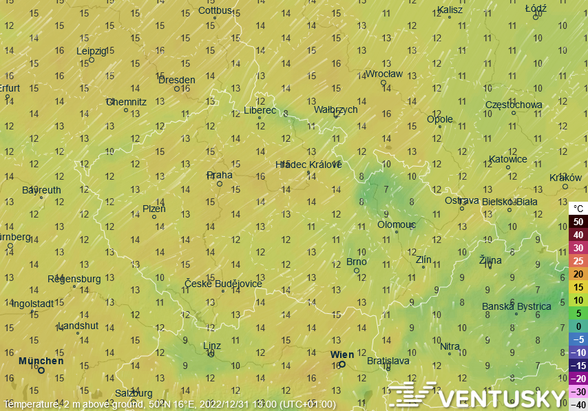 Očekávané teploty v sobotu odpoledne