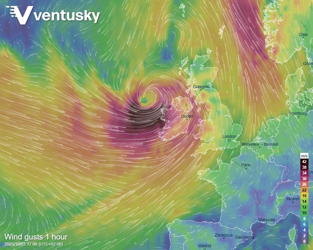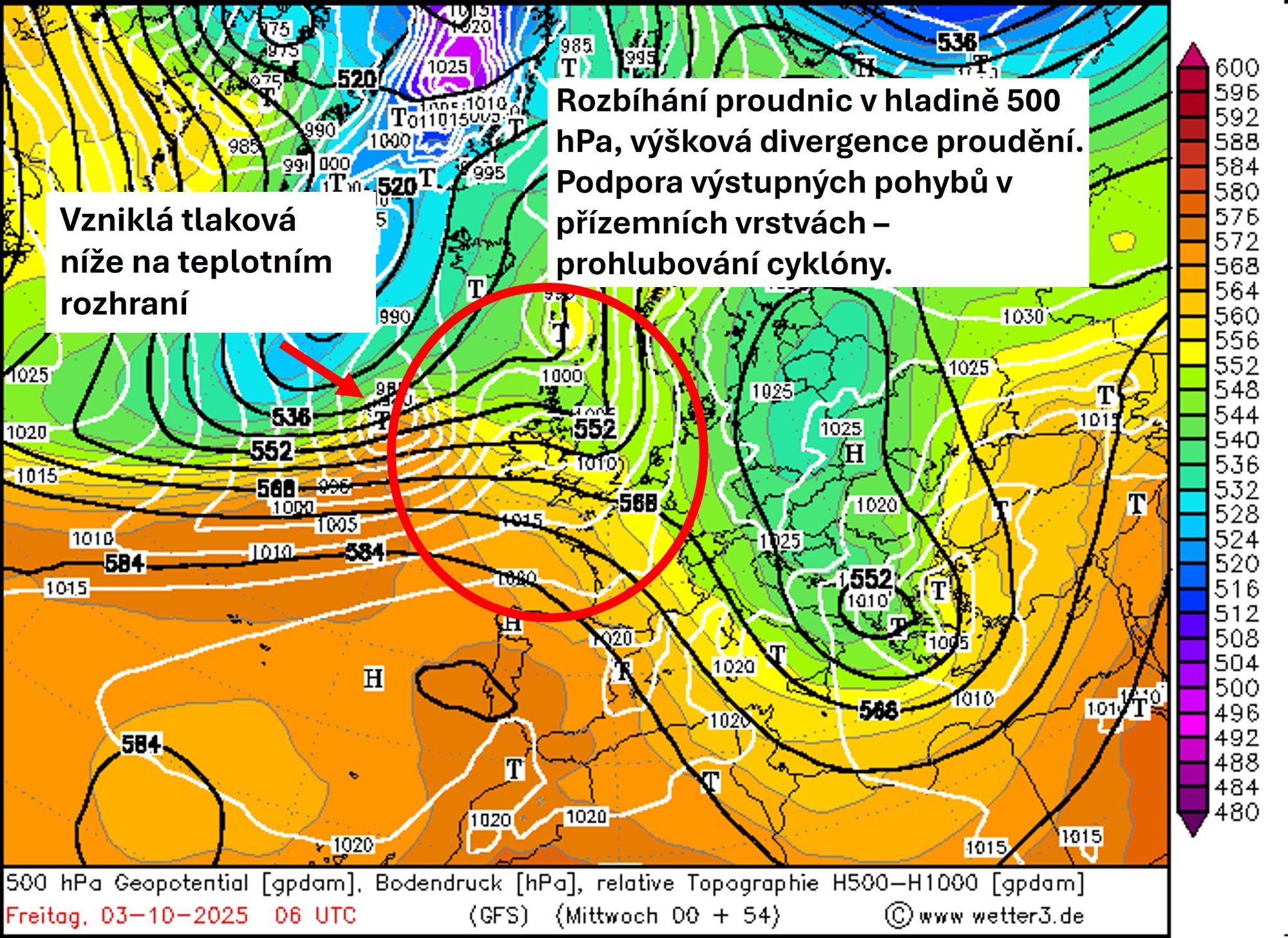 Obr. 4 Rozložení přízemních (bílé linie) a výškových (černé linie) tlakových útvarů nad Evropou a severním Atlantikem v pátek 3. 10. 2025 v 6:00 UTC