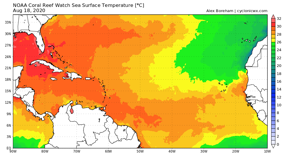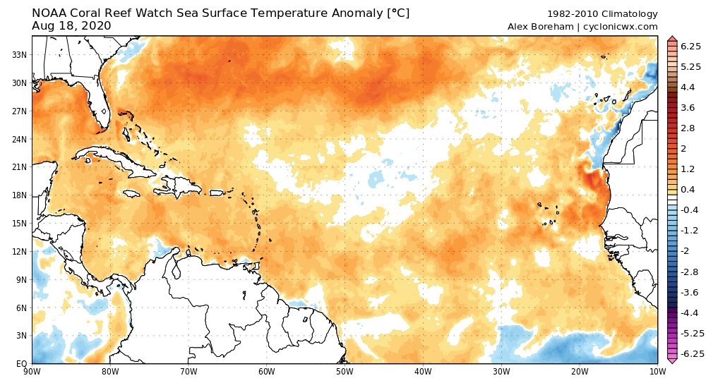 Obr. 2: Odchylka povrchové teploty mořské vody v tropickém Atlantiku