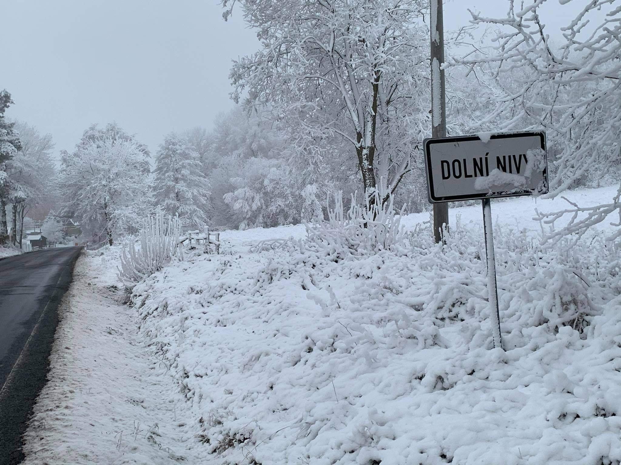 Dolní Nivy na Sokolovsku včera během dne, kdy zde napadlo kolem 5 cm sněhu