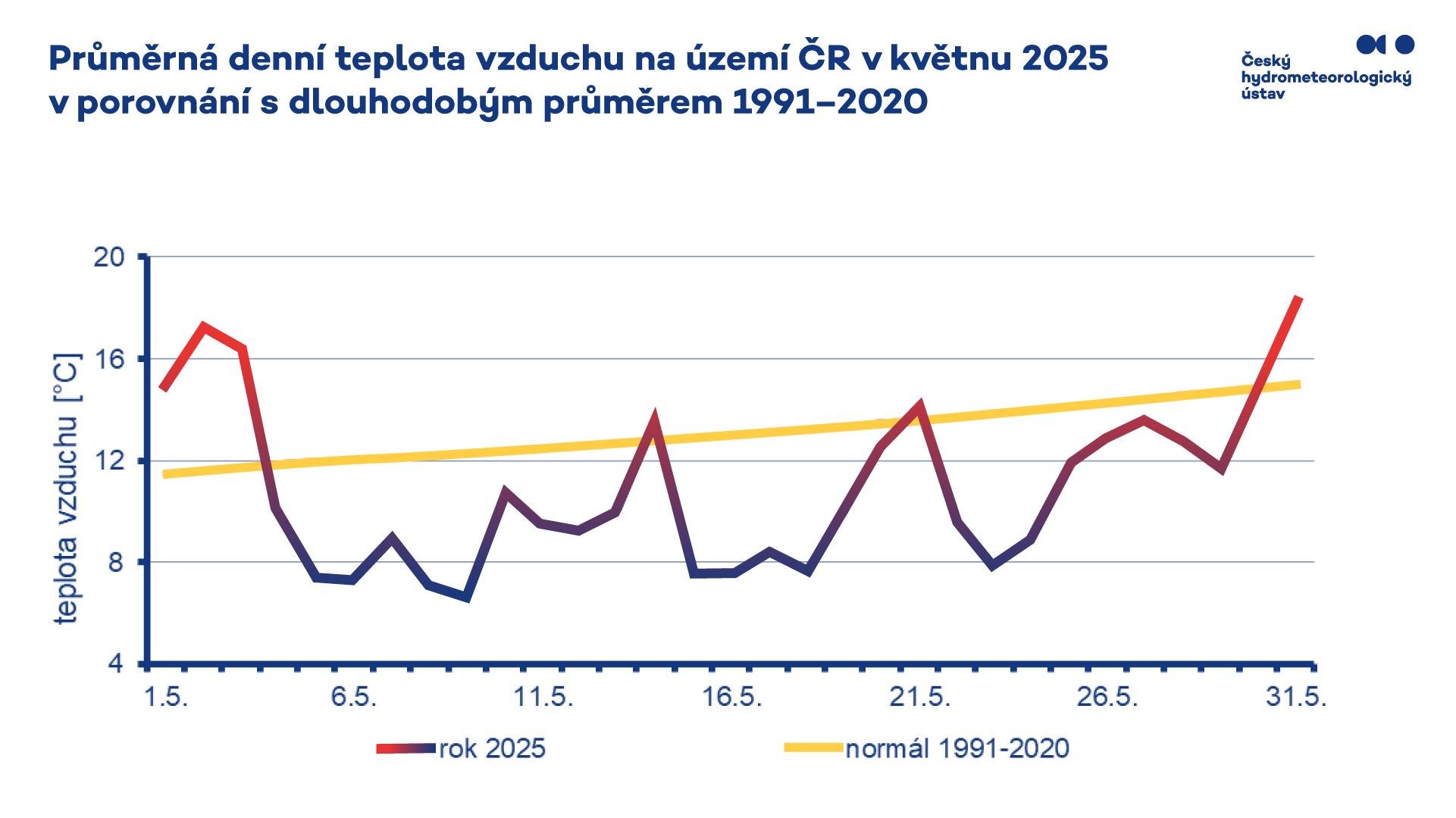 Průměrná denní teplota vzduchu v květnu - ve většině dnů byla teplota podprůměrná