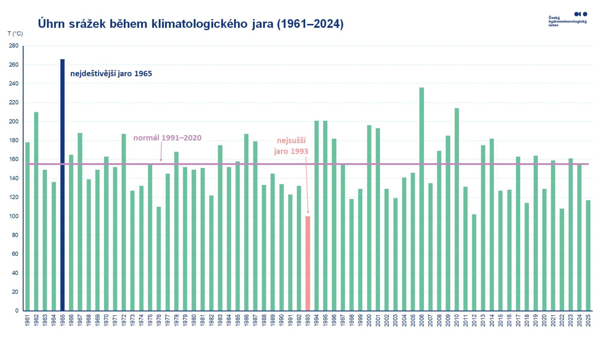 Úhrny srážek během jara 1961–2025 ve srovnání s normálem 1991–2020