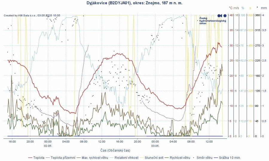 Měření ze stanice v Dyjákovicích na jihu Moravy za posledních 48 hodin - teplota je znázorněna červenou čarou (teplota se dostala nad 30 °C), zdroj: chmi.cz