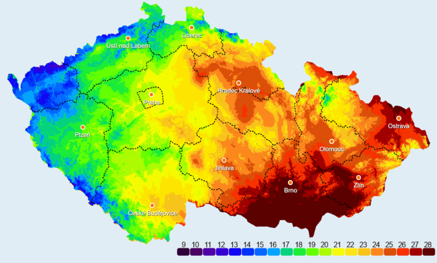 Zatímco na Moravě byly měřeny tropické teploty, na západě a severozápadě Čech už bylo podstatně chladněji, často kolem 16 °C. Zítra teploty výrazně klesnou na celém území, na řadě stanic se budou maxima lišit o více než 10 °C. Nejvyšší denní teploty se zítra čekají mezi 12 °C až 16 °C, na krajním jihovýchodě až 18 °C. V pondělí se potom ještě více ochladí, denní maxima zůstanou jen mezi 10 °C až 14 °C a budou výrazně podprůměrné.
