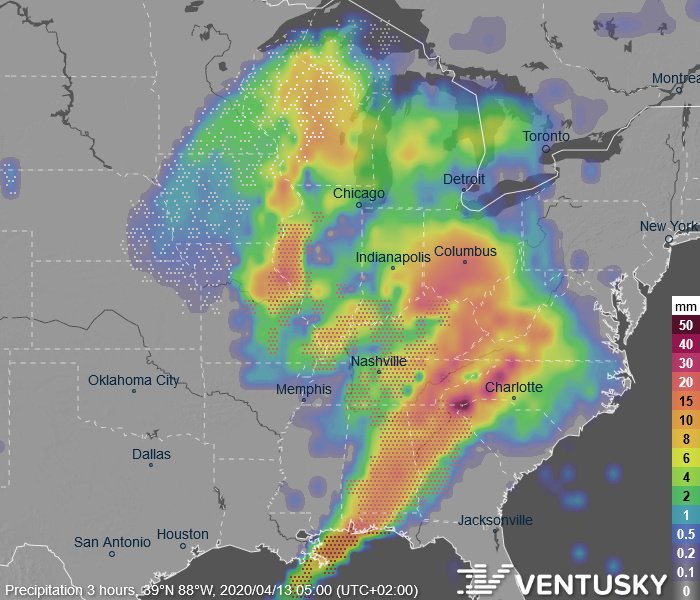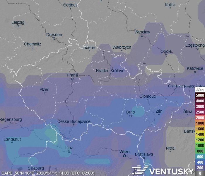 Mapa srážek v noci z neděle na pondělí - na jihu se čekají četné bouřky, na severu naopak bude hustě sněžit