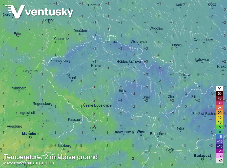 Očekávané teploty v neděli v 16:00 ve výšce 850 hPa (1500 m nad zemí)