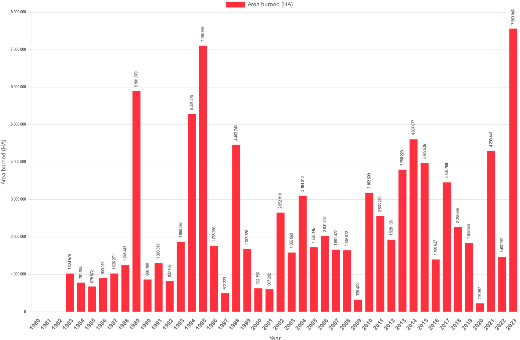 Rozsah plochy zasažené požáry v Kanadě v jednotlivých letech od roku 1983 do roku 2023 (hodnota za rok 2023 ještě není zdaleka konečná)