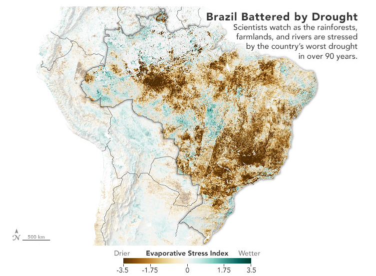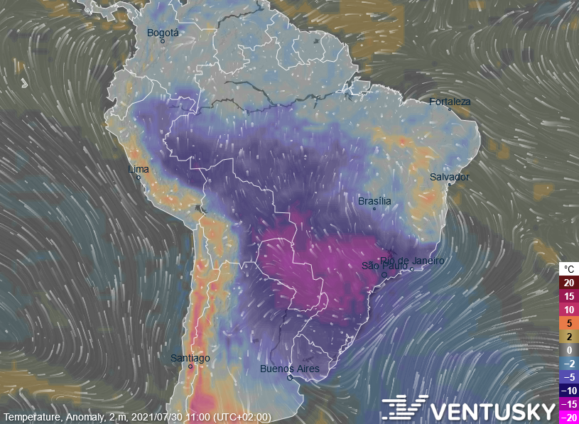 Odchylka teplot od dlouhodobého průměru v jižní Americe dne 30. července 2021 - na jihu Brazílie byly teploty o 10 °C až 15 °C nižší, než je v tomto období obvyklé (teploty zde klesly k bodu mrazu)