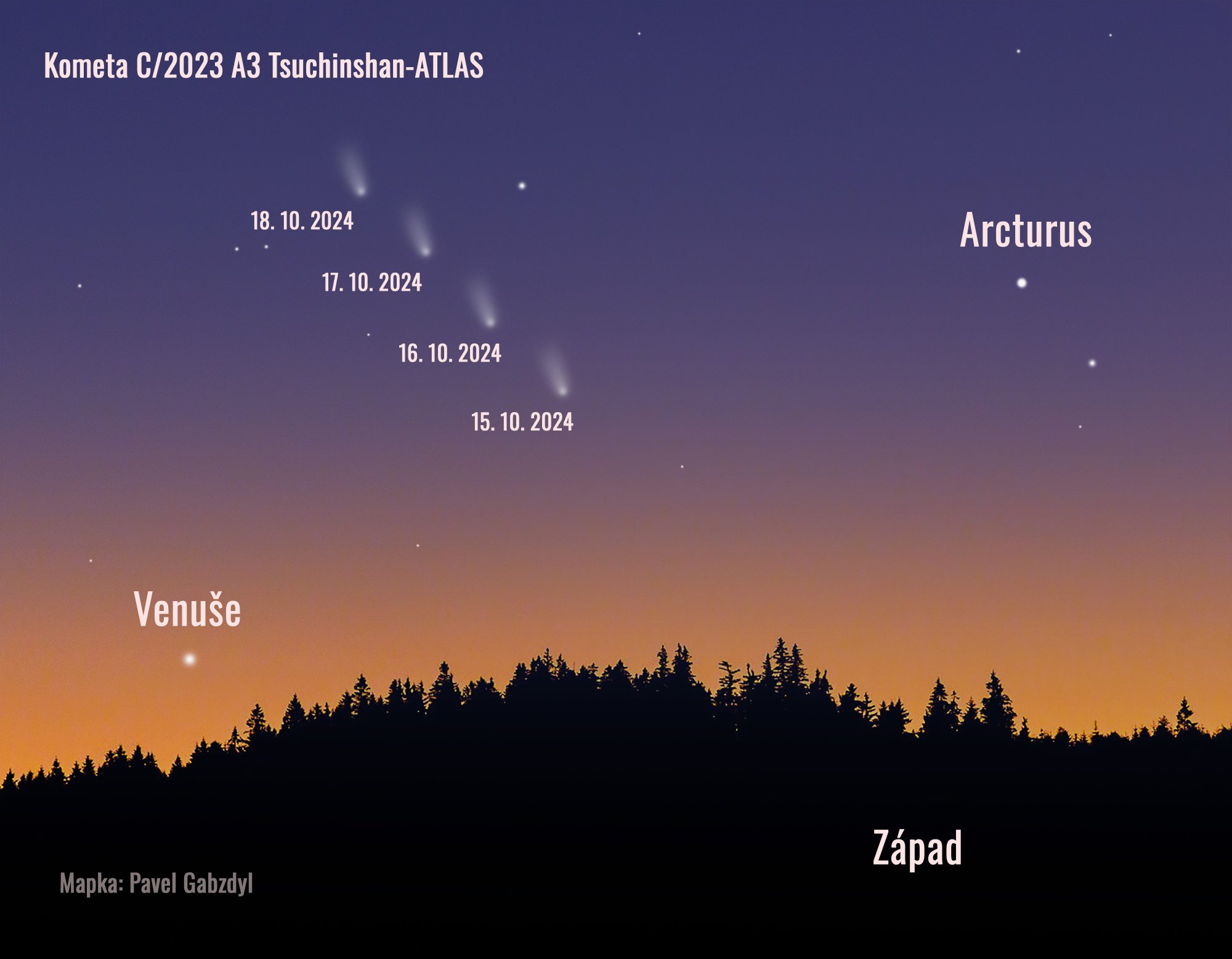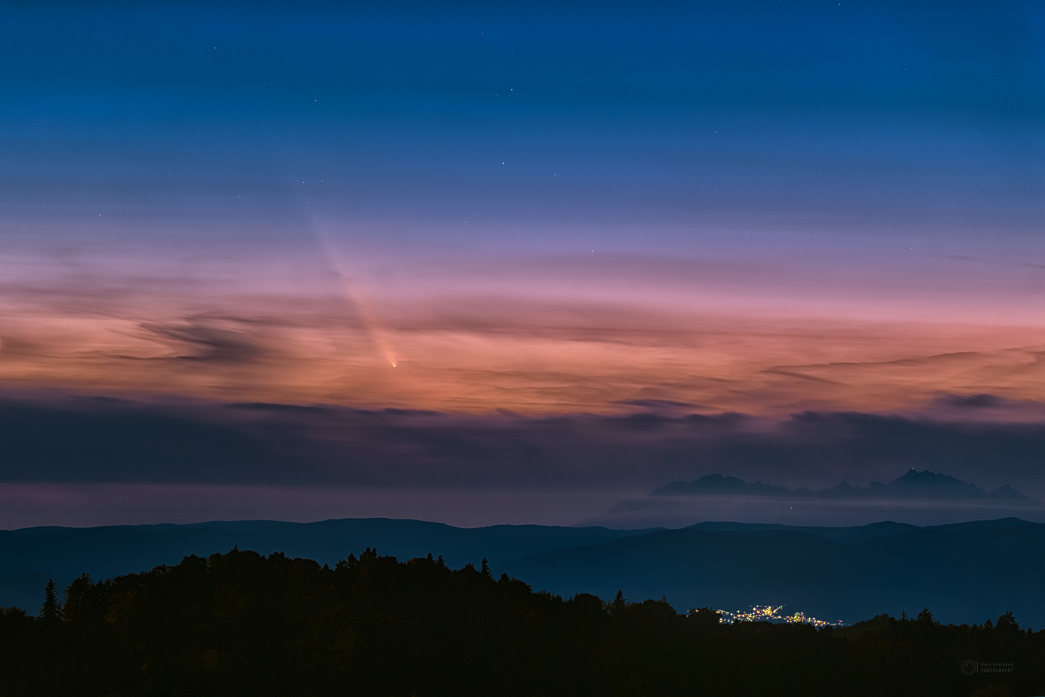 Snímek komety C/2023 A3 Tsuchinshan-ATLAS ze slovenského Sabinova za soumraku nízko nad západním obzorem 12. října 2024