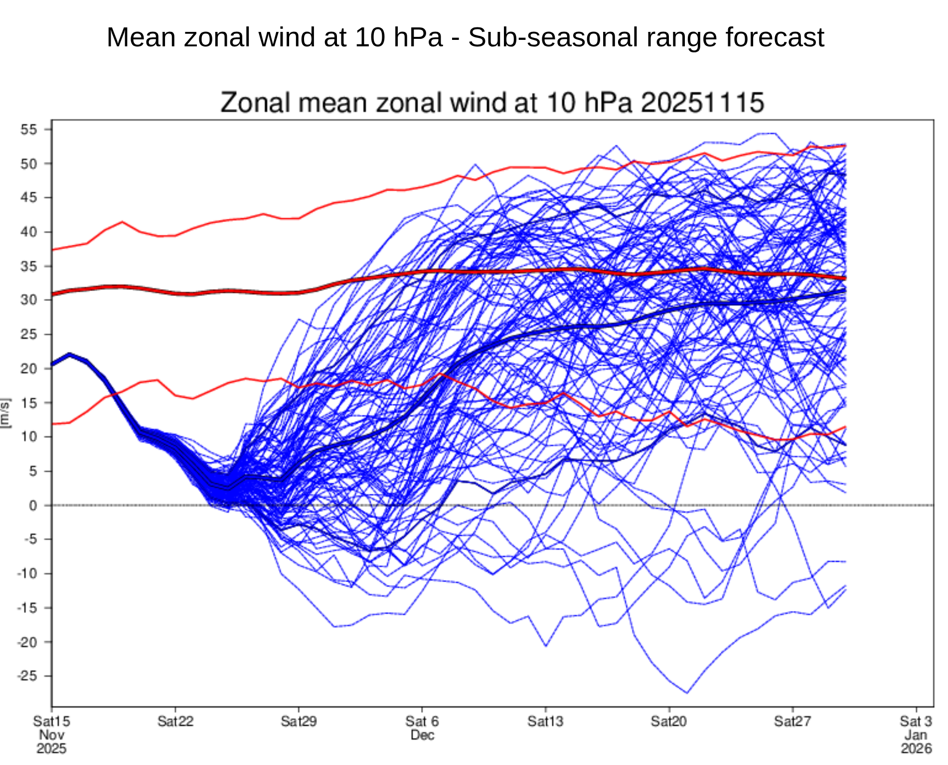 Obr. 4 Týdenní průměrná anomálie teploty vzduchu v tlakové hladině 10 hPa mezi 24. 11. a 1. 12. 2025. Teplejší vzduch nad Arktidou ukazuje událost SSW